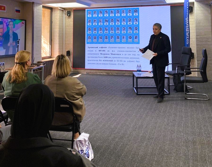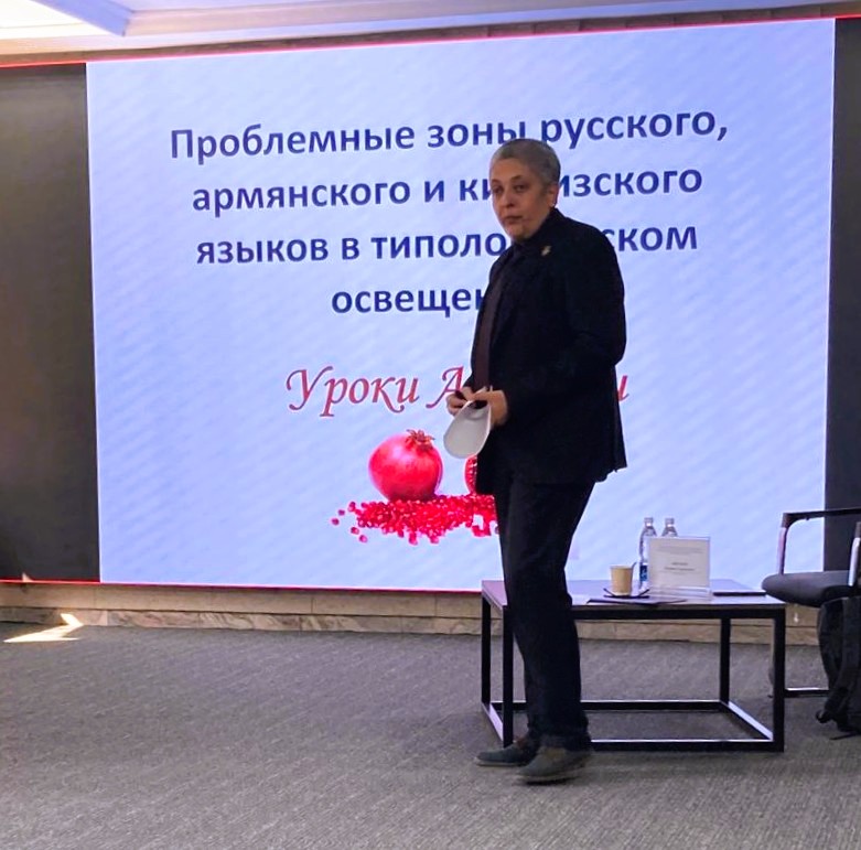 В рамках открытия «Школы профессионального мастерства» были проведены различные тренинг-сессии и мастер-классы. На практической тренинг-сессии для педагогов-филологов старшей и высшей школы выступил Карен Суренович Акопян, проведя мастер-класс на тему «Уроки Армении: проблемные зоны русского, армянского и киргизского языков в типологическом освещении». Последовательно дифференцируя два уровня речевой деятельности – язык и речь, он представил богатство фонологической (и графической) системы армянского языка и подчеркнул возможности, таящиеся в фонетической системе русского языка, выявляемые при сопоставлении с армянским и киргизским языками. На морфологическом уровне Акопян К.С. подробно описал сложности, с которыми сталкиваются армянские и киргизские обучающиеся при изучении русского языка, вызванные различием в основных грамматических способах, реализуемых русским, армянским и киргизским языками (на примере словоизменения существительных).