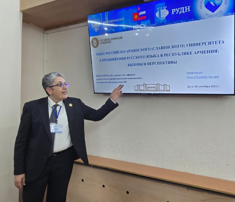 26 сентября после пленарного заседания на стратегической сессии с представителями российско-национальных (славянских) университетов Карен Акопян выступил с докладом «Опыт Российско-Армянского (Славянского) университета в продвижении русского языка в Республике Армения: вызовы и перспективы». Он отметил сохранение прочных позиций русского языка в научной коммуникации и рост числа граждан, владеющих им, согласно данным последней переписи населения (2022 год). Вместе с тем подчеркнул новые сложности, связанные с изменением статуса русского языка в системе общего образования Армении – переходом его из базового в разряд иностранных языков, что сопровождается сокращением учебных часов и необходимостью обновления методики преподавания. В качестве ответных мер Карен Акопян предложил организовывать совместные курсы повышения квалификации для учителей, создавать современные учебники нового поколения коллективами соавторов и проводить языковые смены в детских летних лагерях. Акопян К.С. подробно осветил деятельность кафедры русского языка и профессиональной коммуникации и Центра русистики РАУ, приведя статистику научных, методических и культурно-просветительских мероприятий, реализованных в 2024–2025 учебном году. Особое внимание уделил плодотворному сотрудничеству с российскими партнерами, прежде всего с Институтом русского языка РУДН, что способствует укреплению позиций русского языка и расширению русскоязычного образовательного пространства в Армении.