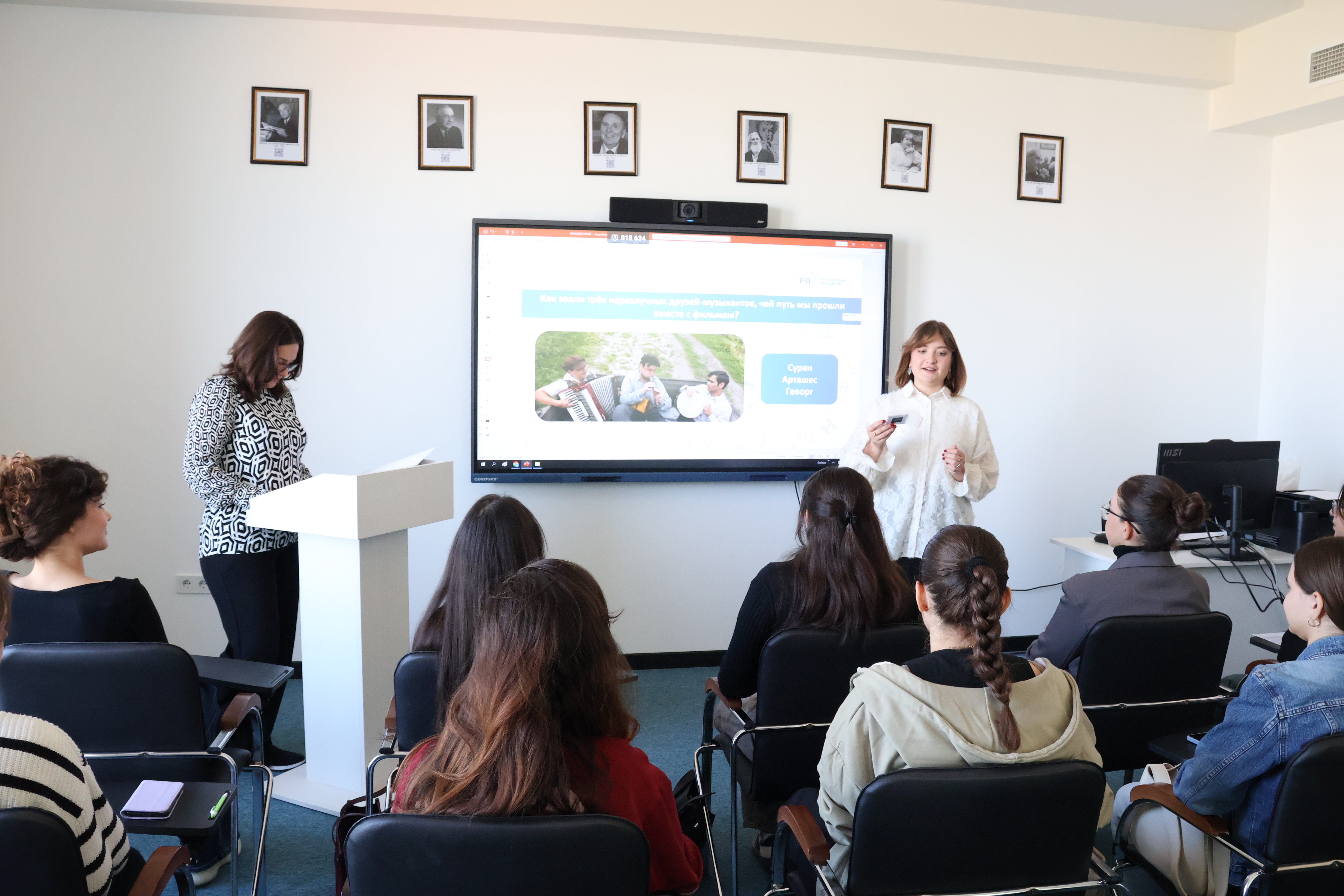 Кульминацией встречи стала интерактивная викторина по фильму Сарика Андреасяна «Война и музыка» (2025 г.). о трёх друзьях-музыкантах, сумевших сохранить верность себе и искусству даже на фронте. Кинокартина вызвала оживлённую дискуссию: студенты делились впечатлениями, размышляли о том, как сила искусства помогает человеку оставаться человеком в нечеловеческих условиях.