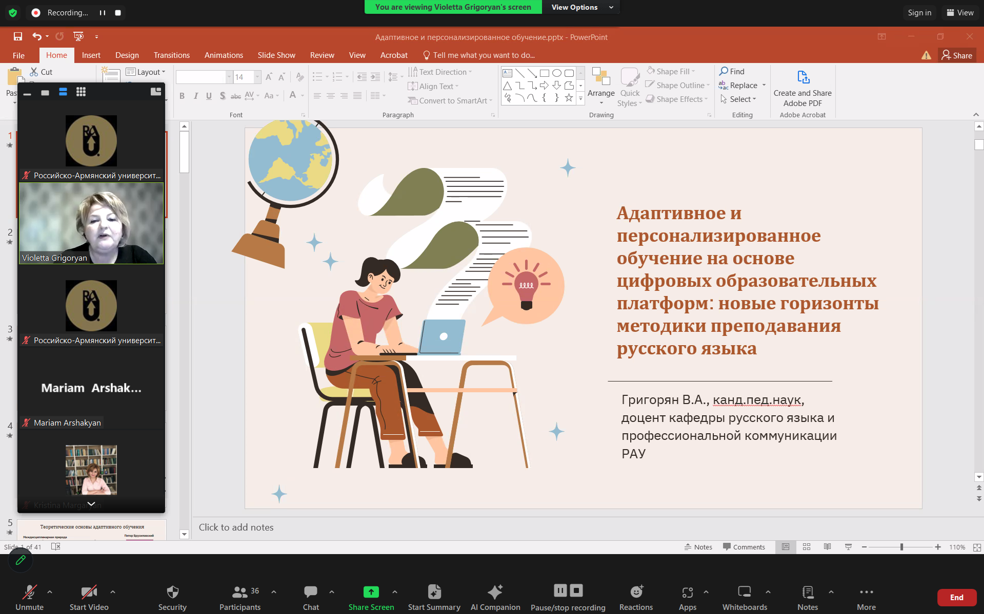 Григорян Виолетта Амаяковна, к.п.н., доцент, доцент кафедры русского языка и профессиональной коммуникации представила лекцию на тему «Адаптивное и персонализированное обучение на основе цифровых образовательных платформ: новые горизонты методики преподавания русского языка». В своем выступлении докладчик представила современные подходы к индивидуализации образовательного процесса на основе цифровых технологий, а также примеры эффективного использования адаптивных платформ, таких как Smart Sparrow, Knewton, Duolingo, ЯндексУчебник и Moodle, в преподавании русского языка. Григорян В.А. отметила значимость роли преподавателя и учителя как координатора персонализированного обучения, способствующего развитию самостоятельности и мотивации обучающихся.