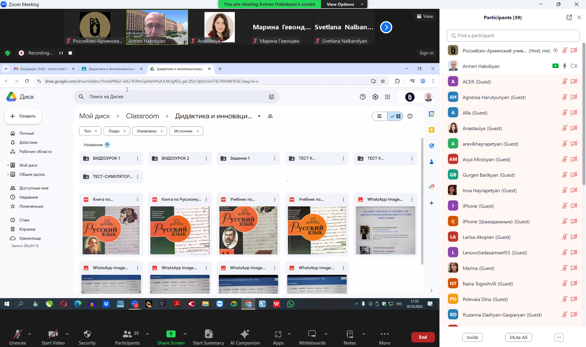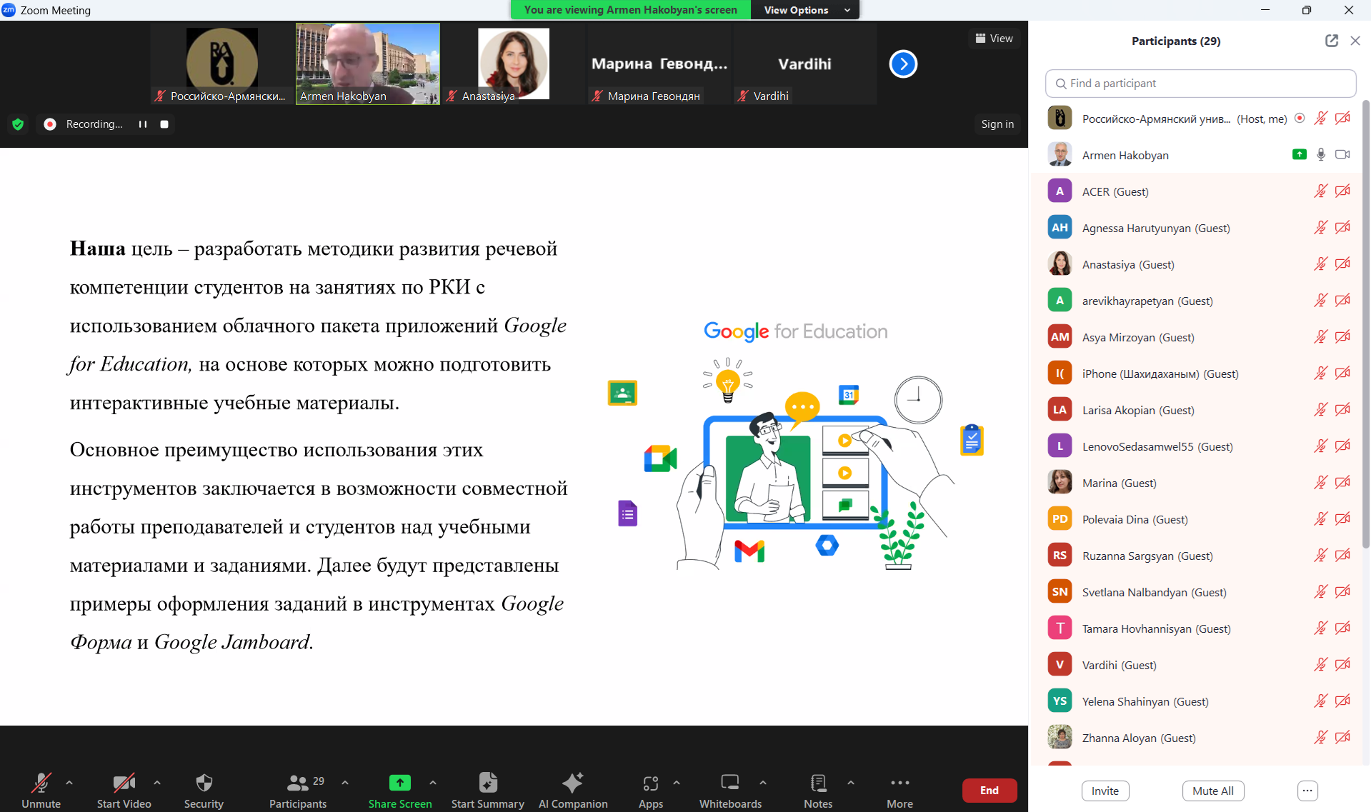 Акопян Армен Суренович, ст. преподаватель кафедры русского языка и профессиональной коммуникации, представил лекцию «Создание цифрового контента в процессе обучения русскому языку», в которой представил новый подход в методике развития речевой компетенции обучающихся на занятиях по РКИ и РКН в студенческой и/или ученической аудиториях с использованием облачного пакета приложений Google for Education. Акопян А.С. привел примеры использования пакета приложений Google for Education для создания интерактивных учебных материалов (Google Формы, Google Jamboard, Google Классрум с интегрированным инструментом Google Meet и мн. др.). Докладчик подчеркнул, что использование облачного пакета приложений Google for Education может значительно улучшить процесс обучения РКИ и/или РКН и развитие речевой компетенции обучающихся.
