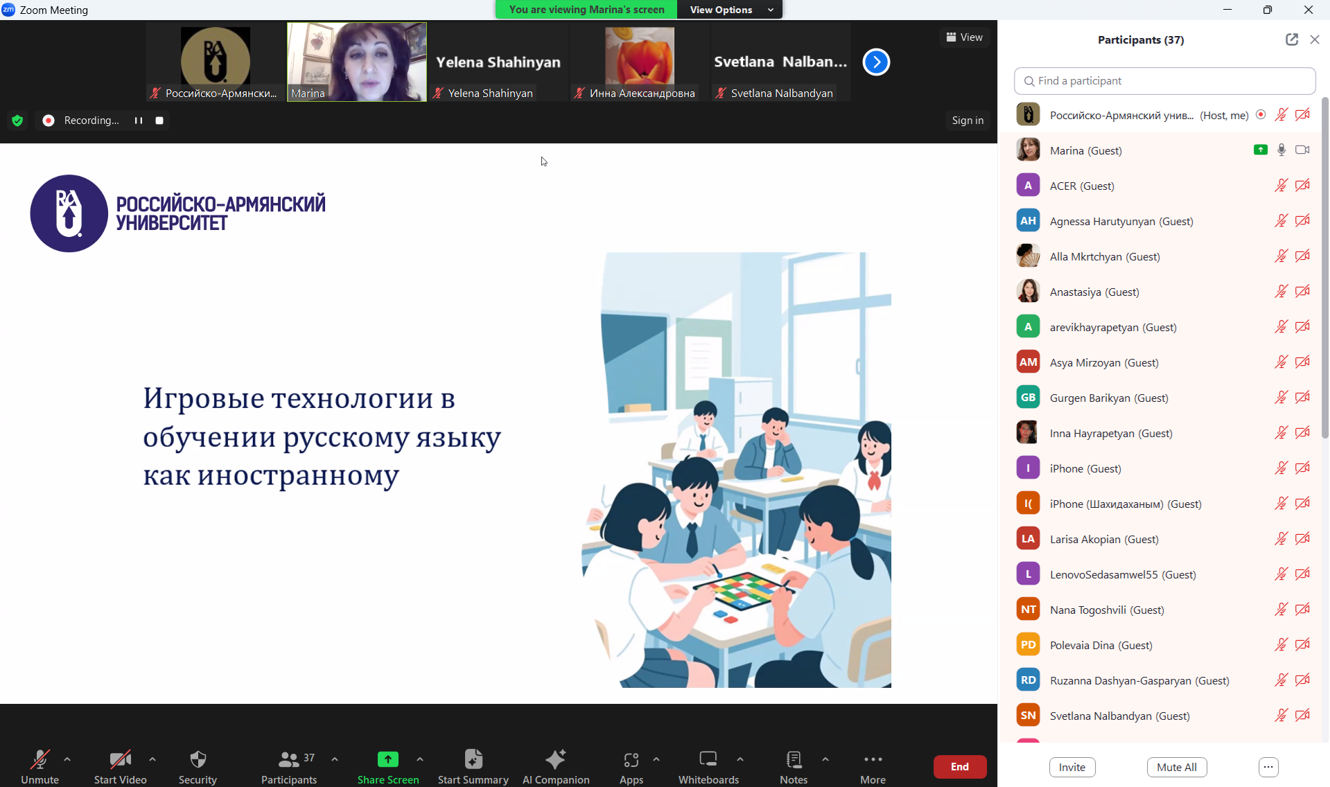 Тунян Седа Араиковна, к.ф.н., доцент, доцент кафедры русского языка и профессиональной коммуникации представила практико-ориентированную лекцию на тему «Инновационные интерактивные методы преподавания РКИ». Тунян С.А. объяснила ряд терминов, связанных с объектом изучения, коснулась теоретической составляющей современного урока, провела обзор интерактивных методов и цифровых ресурсов, используемых ею на уроках по РКИ в РАУ. Лекция была построена на разборе проведенного видеоурока и сопровождалась комментариями лектора относительно примененных методов, их целей и результатов.