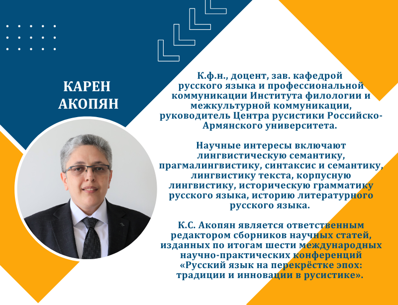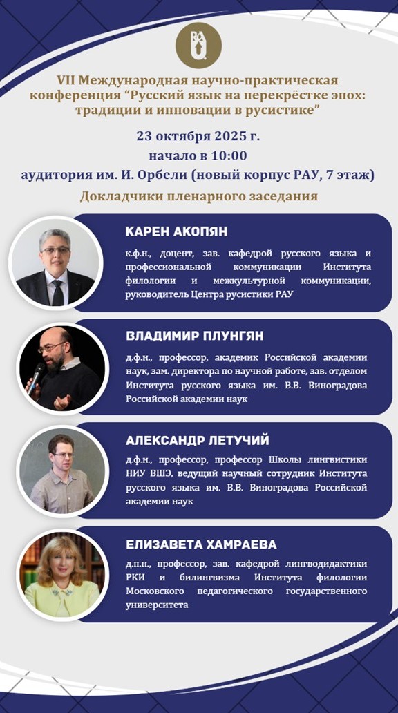 Отметим, что конференция организована Центром русистики РАУ и кафедрой русского языка и профессиональной коммуникации Института филологии и межкультурной коммуникации Российско-Армянского (Славянского) университета.