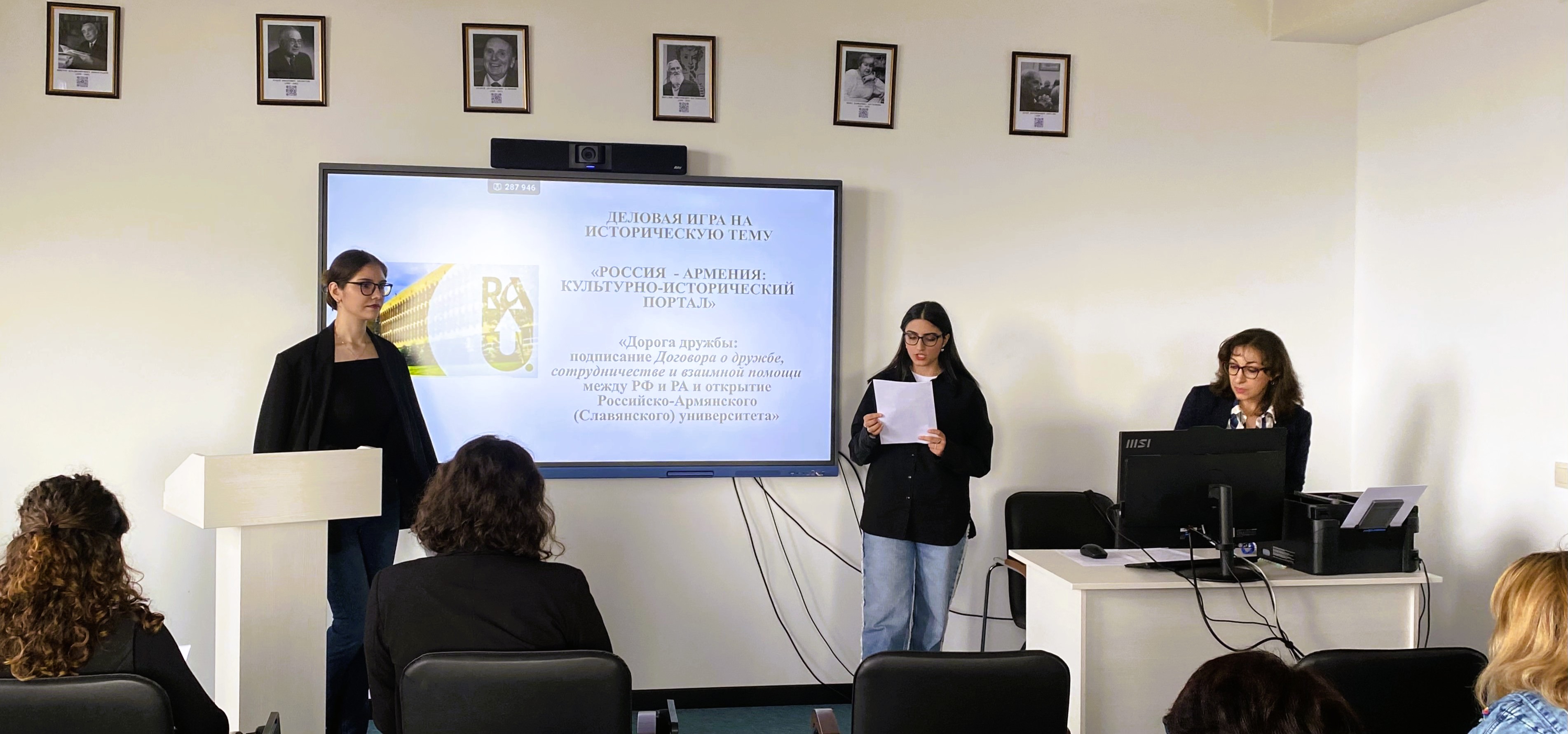 2 октября 2025 года в Центре русистики Российско-Армянского (Славянского) университета состоялась деловая игра на историческую тему «Россия – Армения: культурно-исторический портал. Дорога дружбы: подписание Договора о дружбе, сотрудничестве и взаимной помощи между Российской Федерацией и Республикой Армения и открытие Российско-Армянского (Славянского) университета». Мероприятие стало результатом совместной работы преподавателей РАУ – к.п.н., ст. преподавателя кафедры русского языка и профессиональной коммуникации Института филологии и межкультурной коммуникации Марины Ашотовны Кочарян – и РУДН им. Патриса Лумумбы – ассистента кафедры русского языка №5 Института русского языка Анастасии Юрьевны Половниковой.